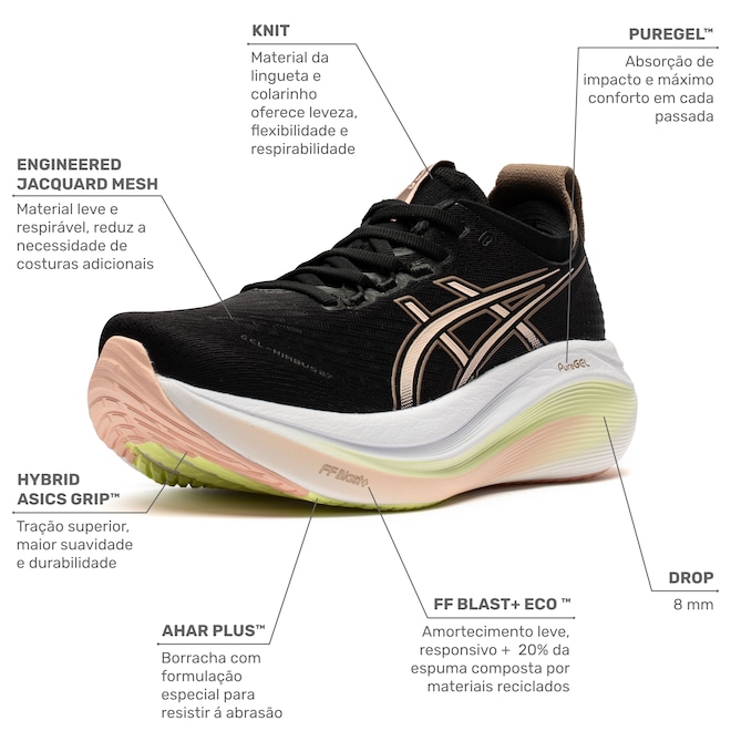 O Tênis ASICS Gel-Nimbus 27 eleva o conceito de conforto, desempenho e sustentabilidade, sendo perfeito para corredores que buscam tecnologia de ponta e impacto reduzido ao meio ambiente.