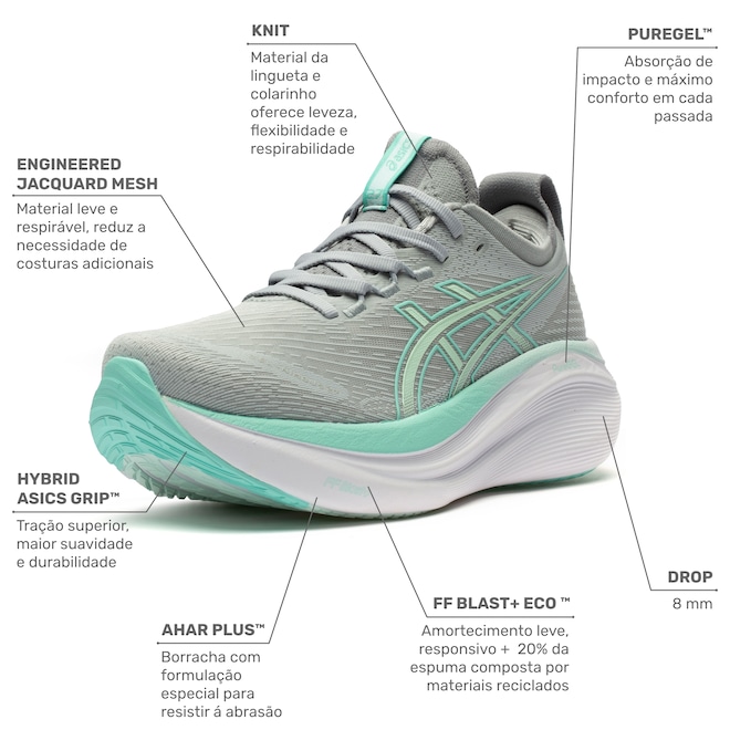 Já a tecnologia PureGel trabalha para absorver impactos de forma eficaz, oferecendo uma experiência de corrida extremamente suave e fluida.