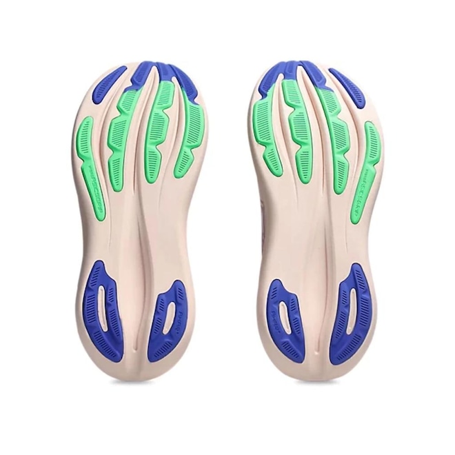 O solado utiliza a tecnologia ASICSGRIP combinada com borracha de alta abrasao em pontos estrategicos. Isso garante uma excelente aderencia em diferentes condicoes de asfalto, alem de prolongar a vida util do calcado mesmo com o uso intenso em treinos de rodagem.