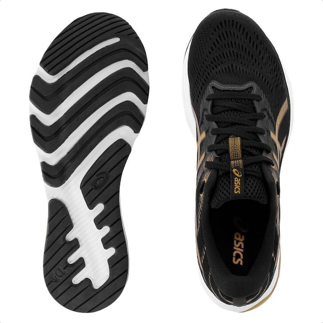 Possui a tecnologia GEL na parte traseira e também entressola em EVA, além do solado emborrachado bastante resistente.
