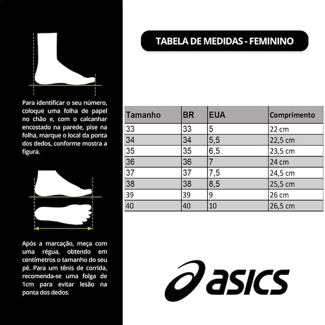 SAC do Fornecedor ASICS: 0800-722-7427 ou através do e-mail fale.conosco@asics.com Conteúdo da Embalagem 1 Par Garantia do Fornecedor Contra Defeito de Fabricação Material do Cabedal Têxtil