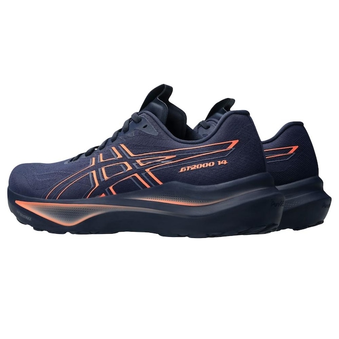Para segurança em corridas noturnas ou em baixa luminosidade, o GT-2000 14 possui detalhes refletivos que aumentam a visibilidade. Além disso, o modelo é pensado de forma sustentável: pelo menos 50% do material do cabedal é reciclado, e o processo de tingimento da palmilha reduz significativamente o consumo de água e as emissões de carbono.