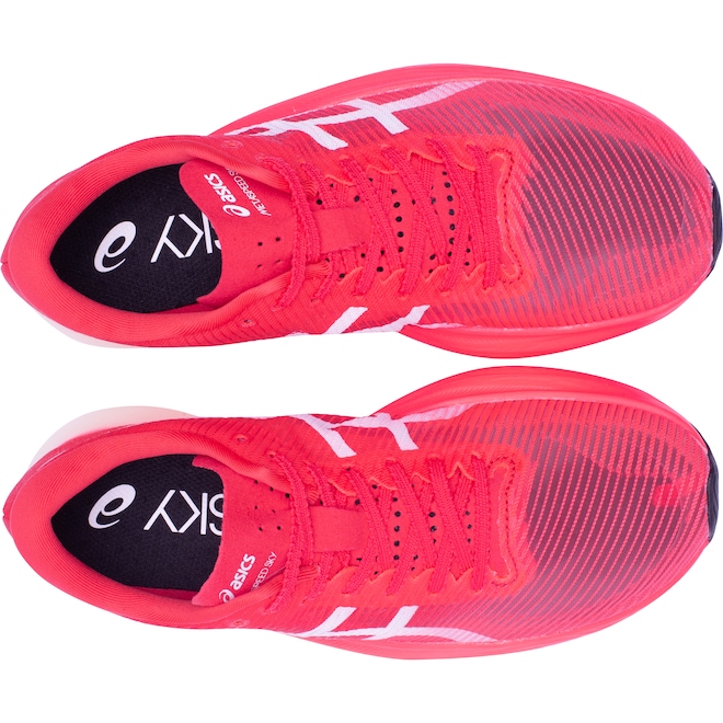 A entressola em EVA e placa de carbono, proporciona amortecimento de impactos e retorno de energia, gerando mais impulso e contribuindo para uma passada suave e confortável. Já o solado emborrachado oferece maior aderência em superfícies instáveis.