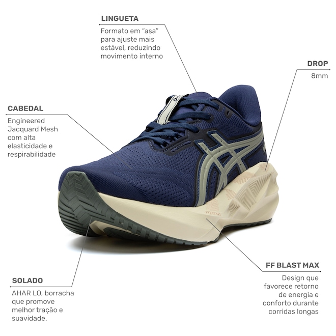 Seu cabedal em mesh proporciona respirabilidade e ajuste anatômico, garantindo conforto do início ao fim da corrida. A entressola com tecnologia FF BLAST MAX oferece amortecimento responsivo e transições suaves, reduzindo o impacto a cada passada.