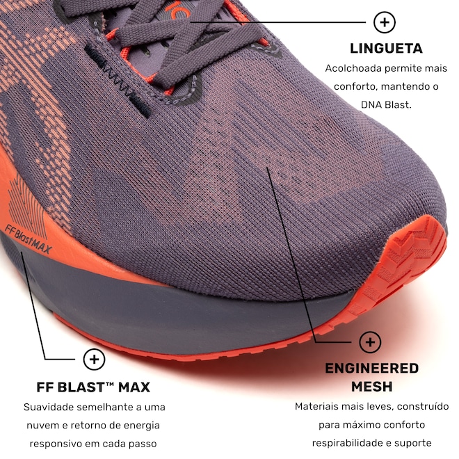 A entressola FF BLAST™ MAX oferece uma experiência única: amortecimento macio como uma nuvem combinado com um retorno de energia responsivo, ideal para quem busca impulsionar cada passada.