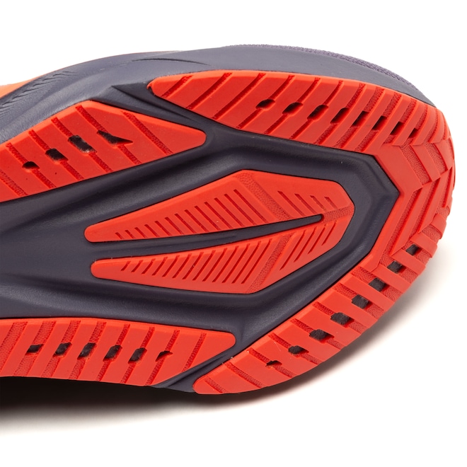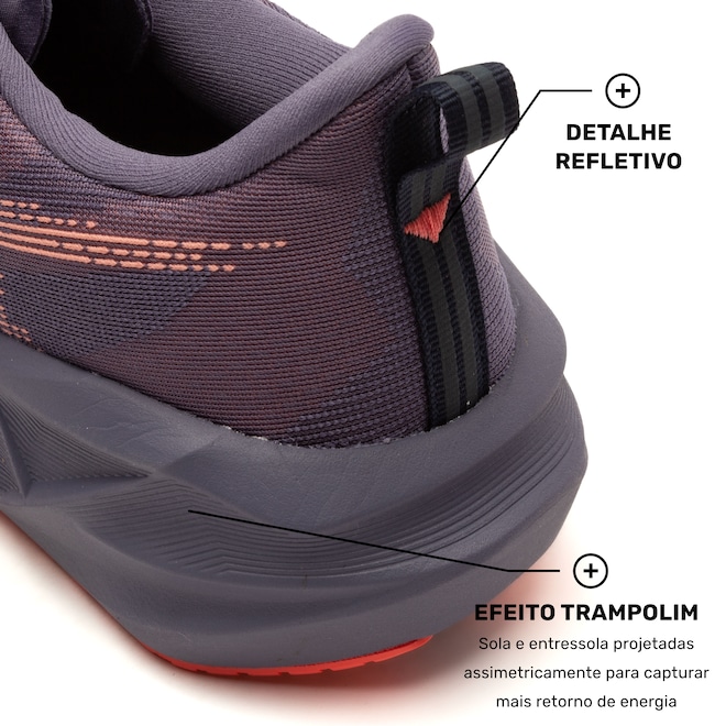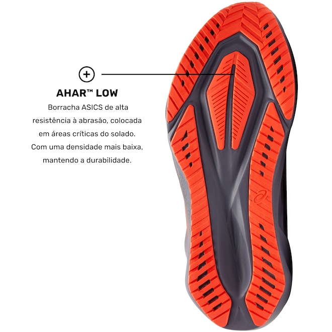 O solado com tecnologia de borracha AHAR™ Low aumenta a durabilidade sem sacrificar a leveza, e o design assimétrico com efeito trampolim maximiza o retorno de energia em cada movimento.