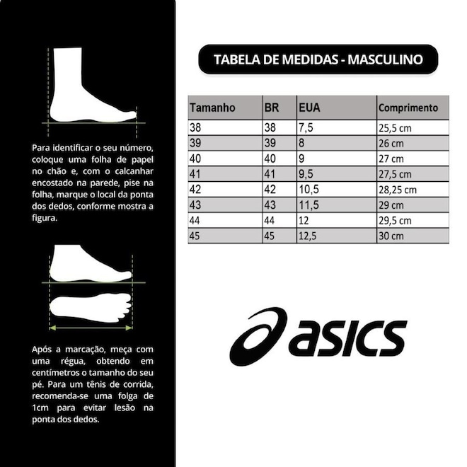 O tênis ASICS ainda conta com lingueta flexível, palmilha removível e forro com reforço acolchoado. Use-o na academia e em treinos ao ar livre, não perca mais tempo. Compre já seu tênis ASICS!