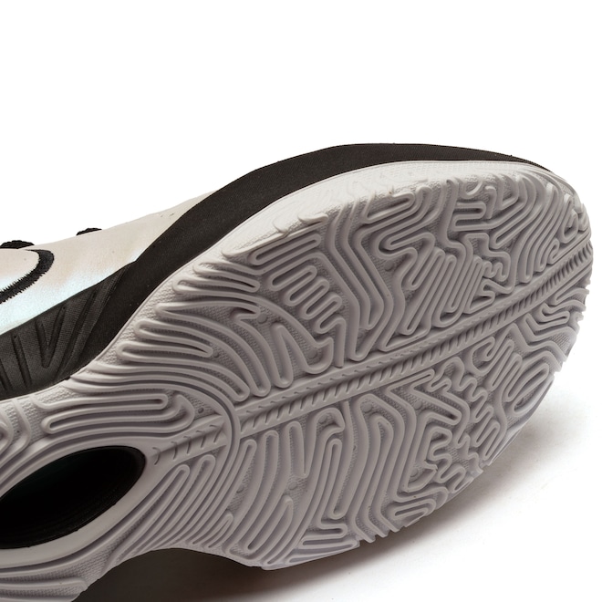 A entressola macia e elástica adiciona uma sensação de conforto como de travesseiro, enquanto a placa de fibra de carbono no mediopé reforça a estabilidade em quadra.