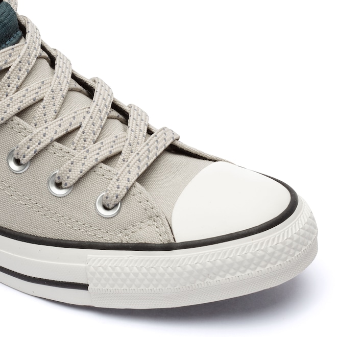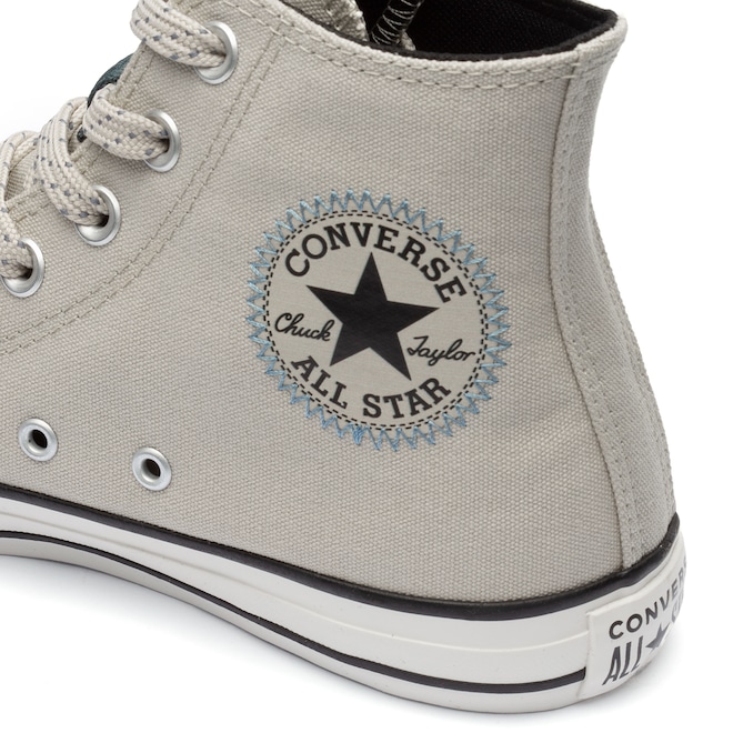 O cabedal de cano alto possui a clássica lona de algodão com entressola reforçada por tira emborrachada em toda a extensão.