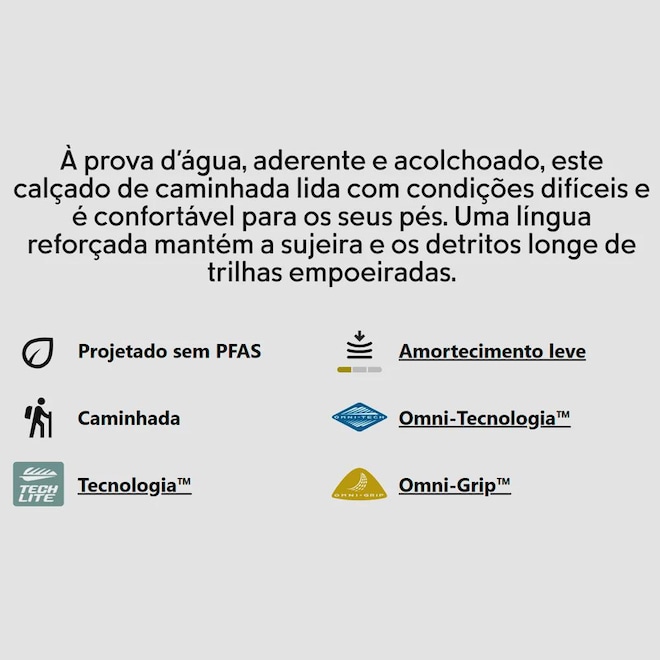 - No cabedal, conte com a Omni-TECH, uma icônica tecnologia de proteção impermeável e respirável da Columbia. A tecnologia possui uma costura selada interna, barrando a entrada de água e vento. Os produtos com selo Omni-TECH protegem da chuva, vento, frio e ainda liberam o calor gerado pelos pés, mantendo uma agradável sensação de conforto ao longo de todo o dia;