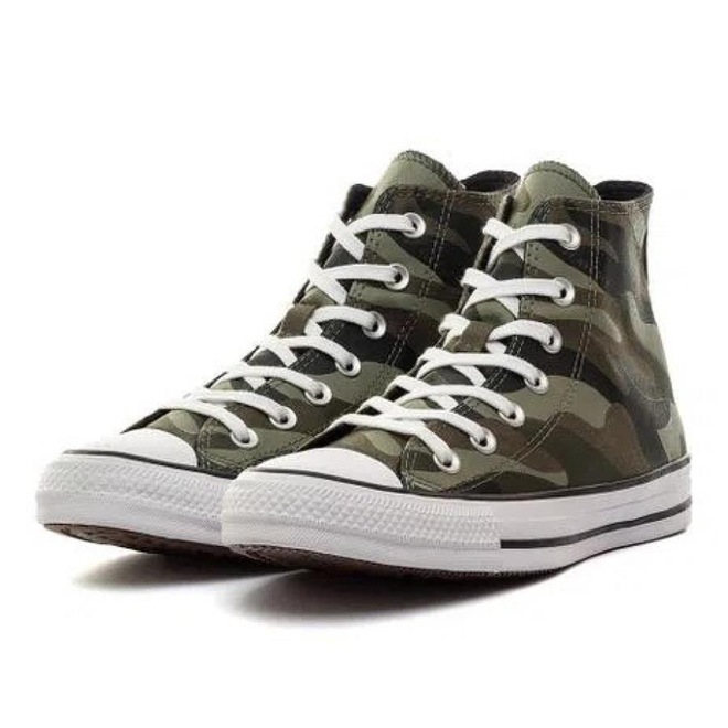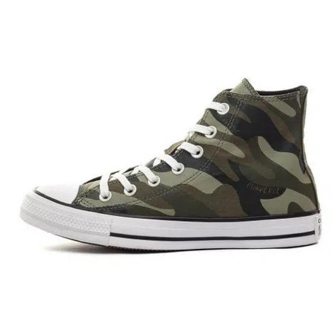Modelo cano alto confeccionado em tecido lona com estampa camuflada em tons de verde militar.