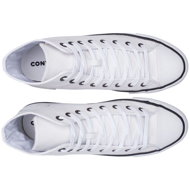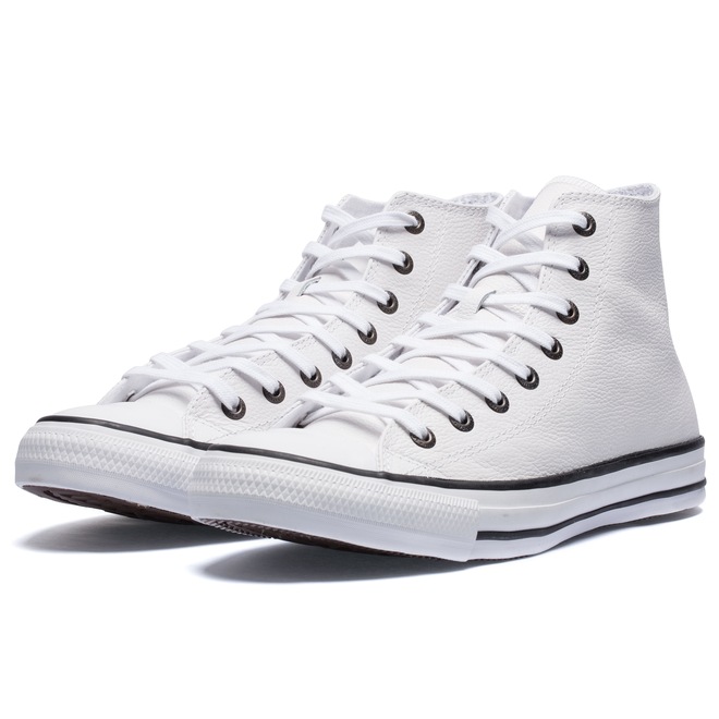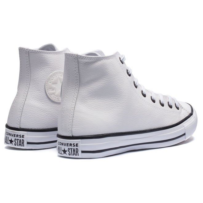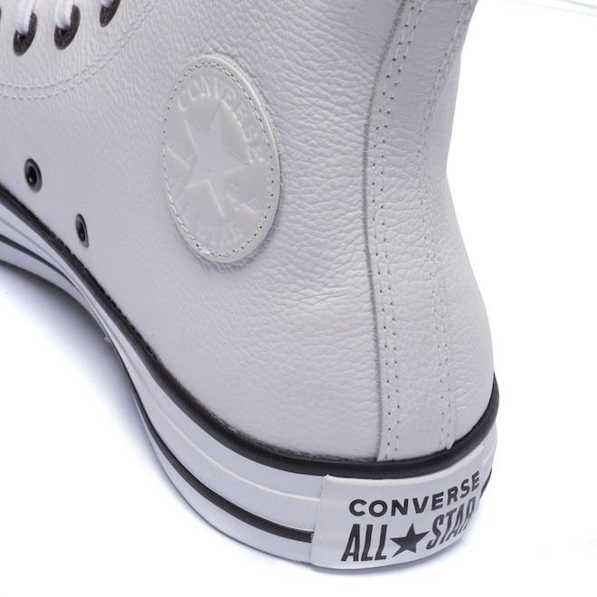 O tênis converse de cano alto conta com estampa do logo no cabedal e solado, além de amarração em cadarço.