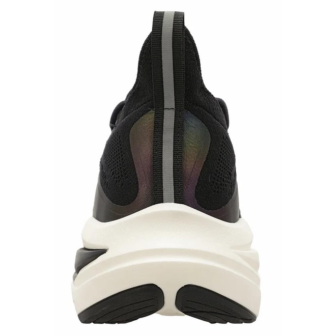 Como o próprio nome sugere, o cabedal é construído em Knit elástico e respirável. Esta malha tecnológica abraça o pé de forma semelhante a uma meia, garantindo um ajuste personalizado e extremamente confortável. A flexibilidade do material permite que o pé se mova naturalmente durante a corrida, enquanto a trama favorece a ventilação para manter a temperatura ideal.