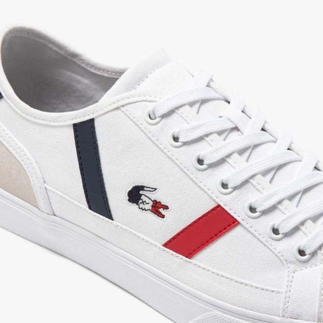 Cabedal em algodão e couro. Barras tricolore. Forro de algodão. Sola de borracha. Crocodilo tricolor bordado na lateral.