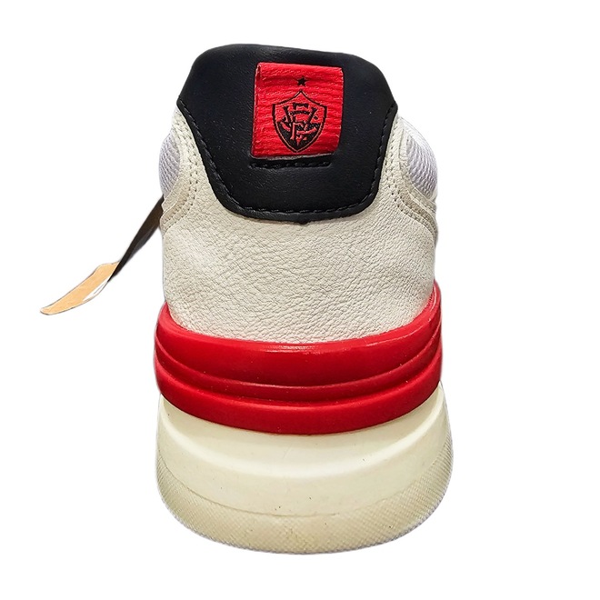 - Couro sintético texturizado vermelho e branco: oferece suporte estruturado com apelo visual sofisticado.