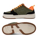 - Cabedal em Sintético: Material resistente com acabamento em musgo e detalhes em laranja e preto, garantindo durabilidade e visual moderno.