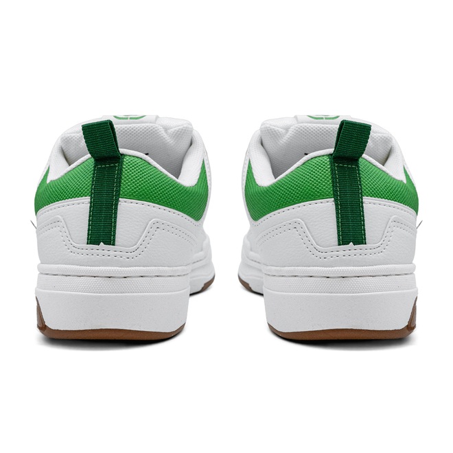 - Cabedal em Sintético: Material resistente com acabamento em branco e detalhes em verde e marrom, garantindo durabilidade e visual moderno.