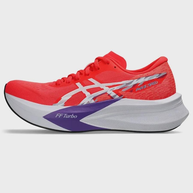 O MAGIC SPEED™ 4 foi desenvolvido para te ajudar a conquistar suas metas durante a corrida. Além da experiência de amortecimento mais suave, este calçado ajuda a estabilizar melhor sua passada. Com uma placa de carbono dentro da entressola para garantir estabilidade e impulsionar seus passos. Cria uma pisada mais macia e propulsora durante a fase inicial do ciclo de pisada. Além disso, este calçado foi atualizado com amortecimento FF TURBO™, que proporciona a sensação de uma corrida mais responsiva e energizada em treinos e competições. Cabedal em Engineered MeshMelhora a respirabilidade Pelo menos 50% do material principal do cabedal é feito com materiais reciclados para reduzir desperdícios e emissões de carbono A palmilha é confeccionada com um processo de tingimento que reduz o uso de água em aproximadamente 33% e as emissões de carbono em aproximadamente 45% se comparada às tecnologias de tingimento convencional Placa de carbono de ponta a pontaAdiciona estrutura e melhora a propulsão na fase inicial do ciclo de pisada. Amortecimento FF BLAST™ TURBO Nosso material de amortecimento mais leve e flexível, 33% mais leve e 13% mais responsivo que o amortecimento FF BLAST™ Solado de borracha ASICSGRIP™ Melhora a tração.-