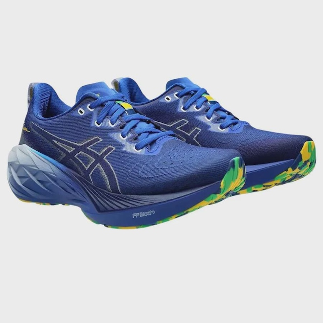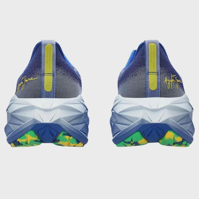 A parceria da ASICS com a marca Senna é unida pela paixão do piloto pela corrida como principal forma de se preparar para pilotar. Senna fazia corridas diárias de mais de 10km em um pace próximo a 4:00/km. Sua filosofia de preparo físico e mental para poder competir converge diretamente com os valores da ASICS e o fruto disso são produtos e experiências incríveis que trazem seu legado para os corredores atuais. As Cores do cabedal são inspiradas no azul do icônico Boné Nacional que Ayrton Senna usou ao longo de sua carreira. A assinatura de Ayrton está em evidência em amarelo próximo ao calcanhar. O gorgorão traz novamente as cores do capacete e a etiqueta da lingueta do lado esquerdo exibe o logo Senna. Já a etiqueta do lado direito mostra o logo da ASICS. O puxador do calcanhar traz um elemento refletivo com os dizeres “Busque Sua Verdade”, o slogan da Marca Senna. A borracha do solado é feita com um efeito marmorizado, usando as cores do capacete. A palmilha vem com o logo ASICS em um dos lados e Senna no outro. O NOVABLAST™ 4 apresenta uma nova geometria de entressola e solado que ajuda a produzir uma passada mais energizada. Uma construção da lingueta em formato de asa que ajuda a melhorar o ajuste enquanto reduz o movimento da lingueta. Novo cabedal que oferece mais elasticidade, respirabilidade e durabilidade. O amortecimento FF BLAST™ PLUS ECO é feito com 20% de materiais de base biológica reciclada. Esta tecnologia ajuda a criar uma aterrissagens mais suaves e uma passada mais energizada. Cabedal Engineered Woven oferece elasticidade, respirabilidade e durabilidade avançadas. Construção da lingueta em formato de asa ajuda a melhorar o ajuste no peito do pé e reduz o movimento da lingueta durante a atividade física. Design de solado inspirado no trampolim apresenta uma nova geometria que ajuda a produzir uma passada mais energizada. Pelo menos 75% do material do cabedal é feito com materiais reciclados para reduzir resíduos e emissões de carbono. Detalhes refletivos ajudam a melhorar a visibilidade em ambientes com pouca luz.