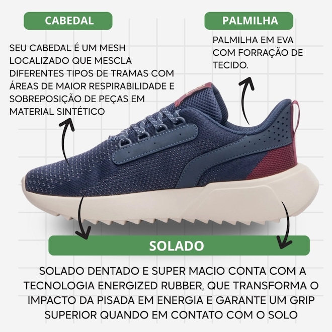 -ENERGIZED RUBBER: tecnologia que transforma o impacto da pisada em energia, oferecendo grip superior e conforto.