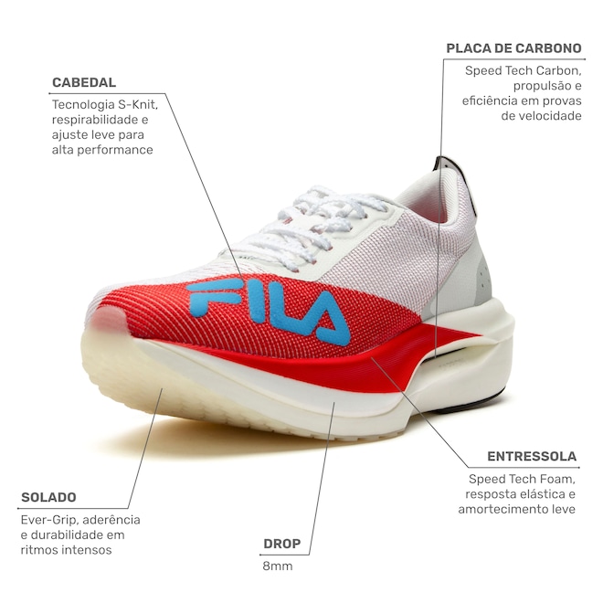 O modelo apresenta a nova placa em carbono Speed Tech Carbon, redesenhada para oferecer propulsão eficiente e respostas rápidas a cada passada.