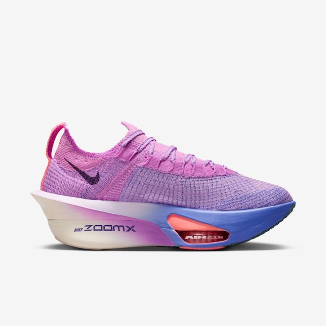 - O Alphafly 3 é o Alphafly mais leve de todos os tempos, com uma placa de fibra de carbono um pouco mais larga para maior estabilidade, uma entressola de espuma ZoomX totalmente conectada para transições mais suaves e uma parte de cima toda nova em Atomknit, projetada para melhor contenção multidirecional e respirabilidade.
