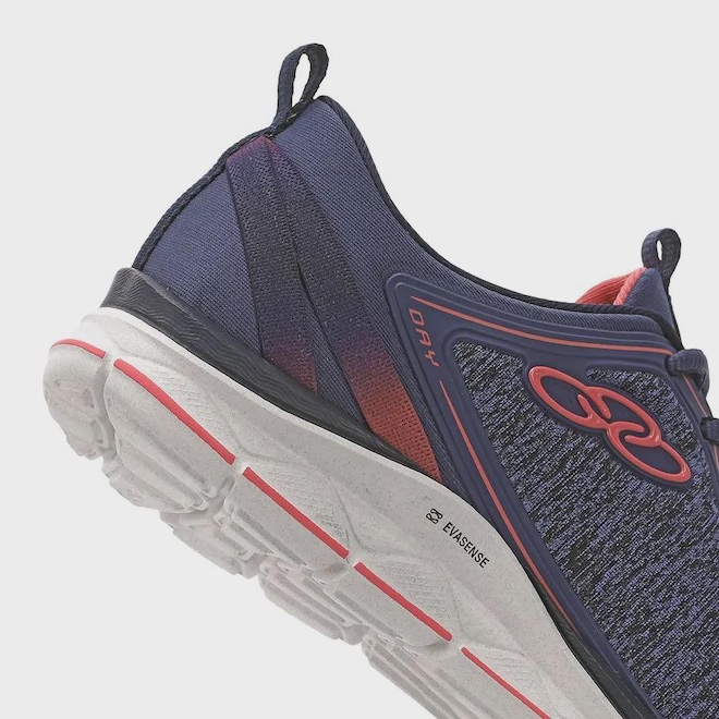 Olympikus Day tem cabedal em tecido macio e sem costuras, fitas elásticas sobre o calcanhar e desenho com recortes na sola. A palmilha Feetpad, que memoriza o formato dos pés, oferece alto conforto devido a espuma visco elastica de alta densidade, e o solado com tecnologia Evasense garantem mais conforto e maciez.
