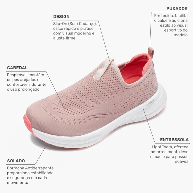 Seu cabedal respirável promove boa ventilação, mantendo os pés secos e confortáveis ao longo do dia. A palmilha macia e o solado com amortecimento eficiente garantem uma pisada suave, enquanto o ajuste anatômico proporciona mais estabilidade e segurança nos movimentos.