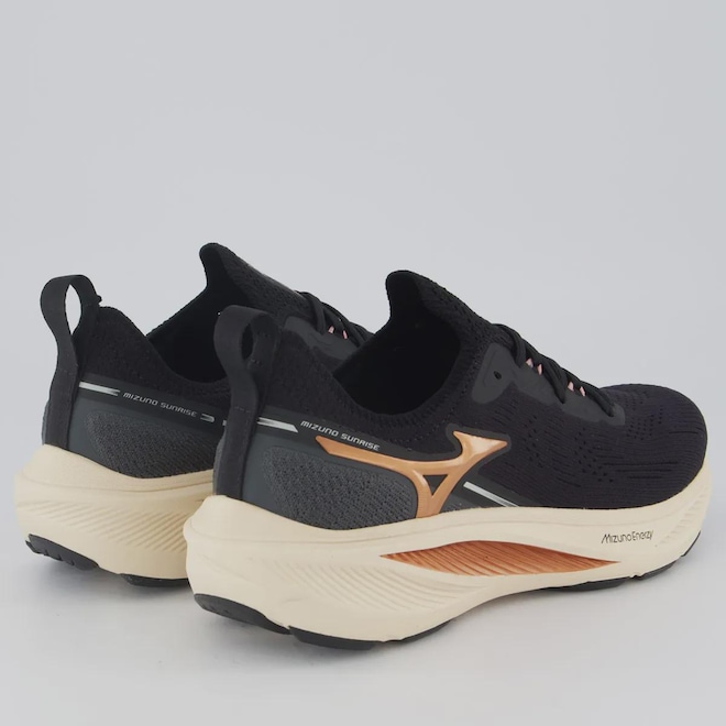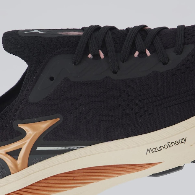 Tecnologias Mizuno Enerzy: tecnologia criada para oferecer um retorno de energia e maciez maiores do que nunca. Composição cabedal (parte superior): Material têxtil respirável Palmilha: Em EVA; forrada, moldada e removível Solado: EVA com alto nível de amortecimento, colado Altura da sola: 5cm Forro: Acolchoamento têxtil reforçado Lingueta: Integrada Cor predominante: Preta Indicado para: Corrida Gênero: Feminino Origem: Nacional Ajuste: Cadarço Peso aproximado: 470g o par nº 37