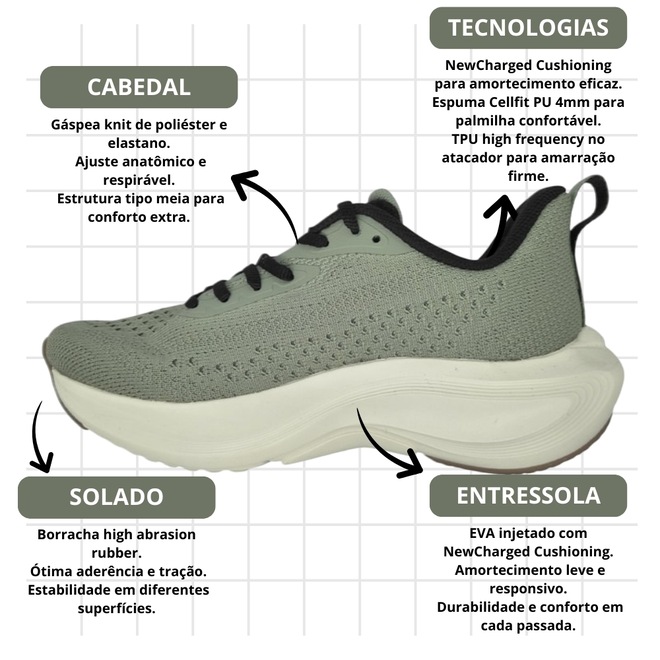 -NewCharged Cushioning: entressola em EVA injetado de baixa densidade que oferece amortecimento responsivo, conforto, memória e durabilidade.