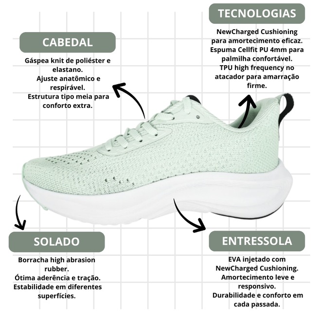 -NewCharged Cushioning: entressola em EVA injetado de baixa densidade que oferece amortecimento responsivo, conforto, memória e durabilidade.