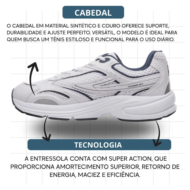 Característica Detalhe Função e Benefício Tecnologia SUPER ACTION (Entressola) Oferece amortecimento superior, retorno de energia, maciez e eficiência a cada passo. Cabedal Material sintético e couro Garante durabilidade, suporte e um visual robusto. Solado EVA com TPU Combina leveza na base (EVA) com resistência e tração (TPU). Conforto Palmilha em EVA e Forro Macio Conforto interno essencial para uso prolongado. Uso Ideal Versátil para Dia a Dia, Trabalho, Lazer, Passeios, Streetwear e Lifestyle. Conteúdo do Kit