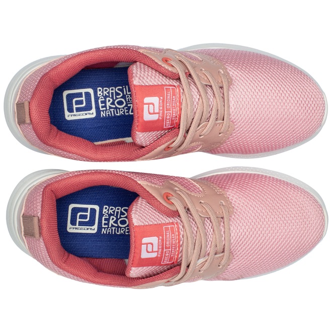 O cabedal (parte superior do tênis) é respirável em mesh (malha em tramas abertas) com entressola e solado em EVA para leve e duradouro amortecimento.