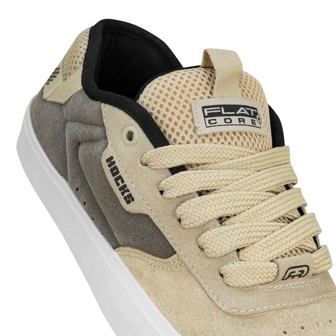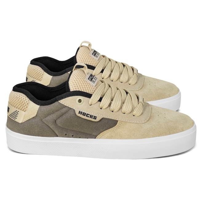 O Tênis Hocks Unissex Flat Core Storm | Bege combina a textura refinada da camurça com um design contemporâneo e versátil. Com um tom bege neutro e elegante, esse modelo é perfeito para quem valoriza conforto e estilo em produções urbanas e sofisticadas.