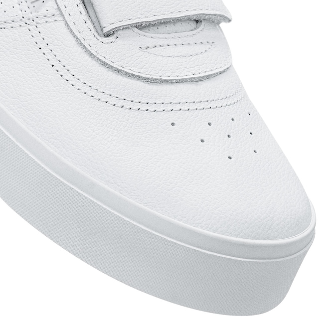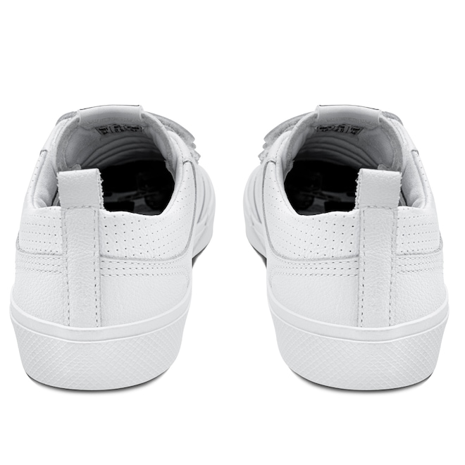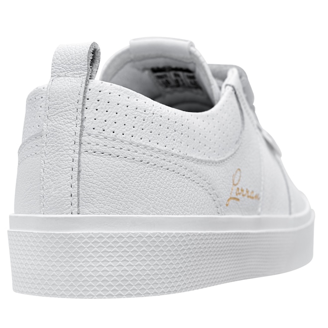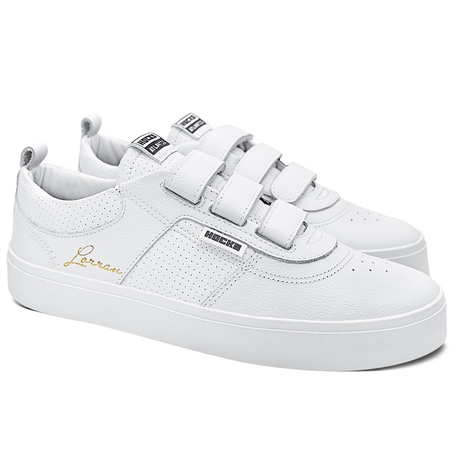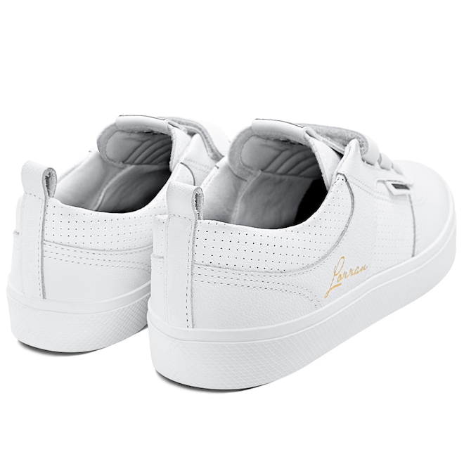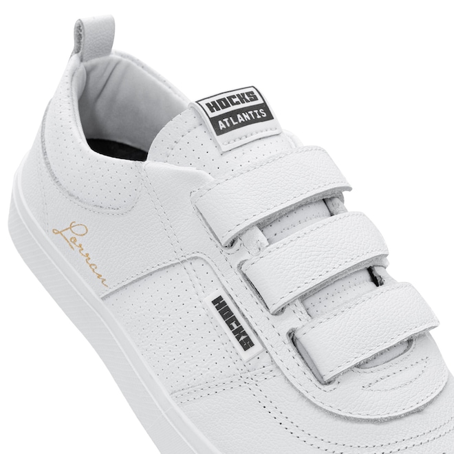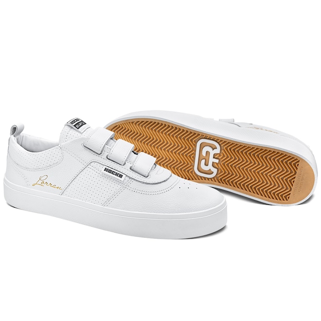 Com cabedal em couro branco natural e sintético PVC perfurado, o modelo traz a assinatura de Lorran Freitas em dourado, dando um toque exclusivo. As tiras de velcro substituem os cadarços, oferecendo mais praticidade e um ajuste anatômico que mantém o pé firme e confortável. A lingueta foi atualizada para garantir maior firmeza e prolongar o uso do tênis. O solado RubberMax, feito com borracha natural de alta densidade, proporciona excelente aderência e durabilidade, enquanto a palmilha FlexForm em P.U termo conformada oferece conforto e maior vida útil ao calçado.