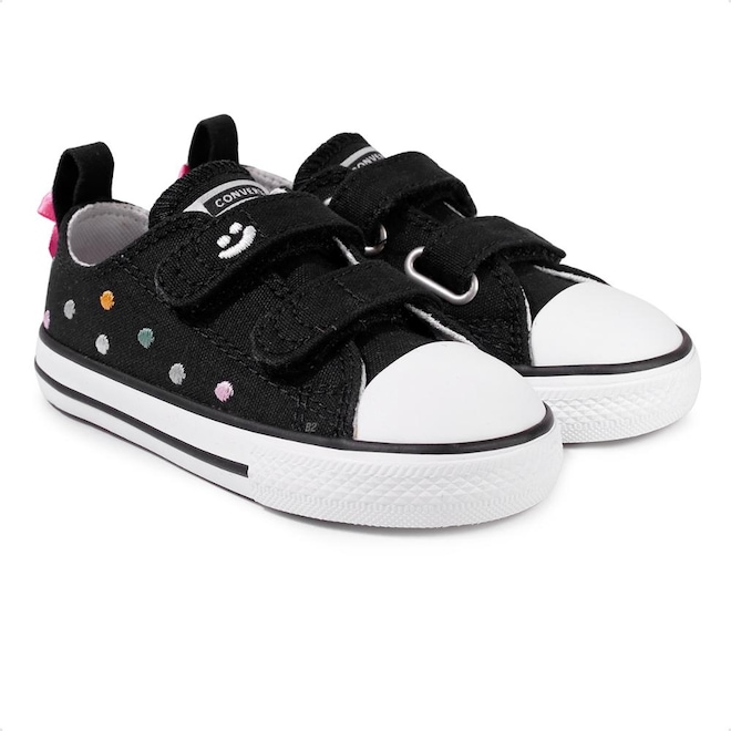 Este é um produto original Converse All Star com garantia vendido pela B2 Online.O Tênis Converse Chuck Taylor All Star 2V Polka Dots é puro charme e estilo para os pequenos! Com estampa de poás (polka dots) divertida e atemporal, ele traz a clássica silhueta Converse em uma versão infantil cheia de personalidade. Modelo conta com duas tiras em aderência que facilitam o calce e garantem maior autonomia para a criança.