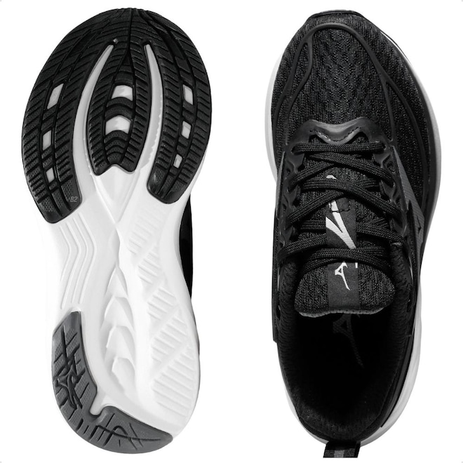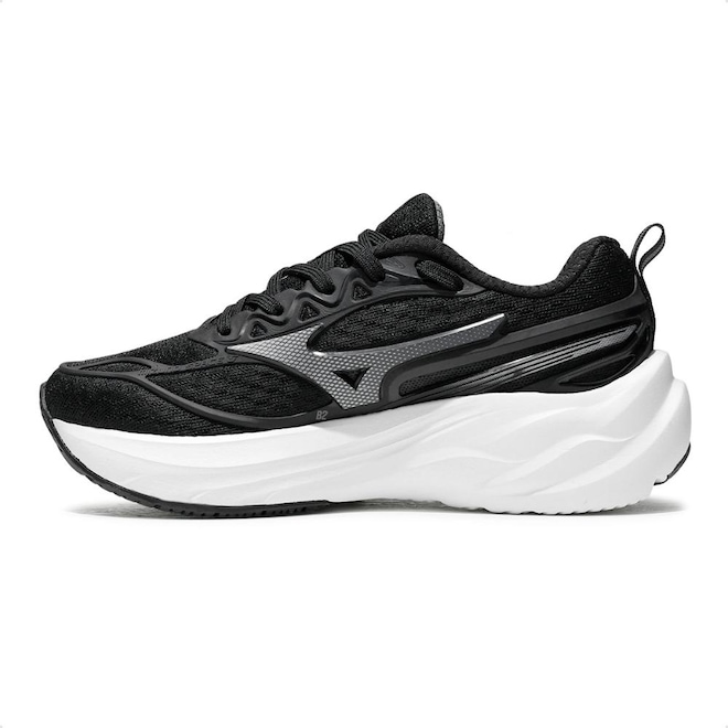 As aplicações injetadas na estrutura proporcionam maior suporte e durabilidade, além de um visual arrojado que reflete o DNA esportivo da Mizuno.