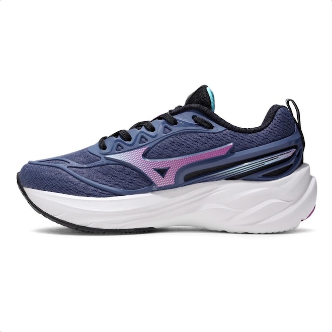 As aplicações injetadas na estrutura proporcionam maior suporte e durabilidade, além de um visual arrojado que reflete o DNA esportivo da Mizuno.