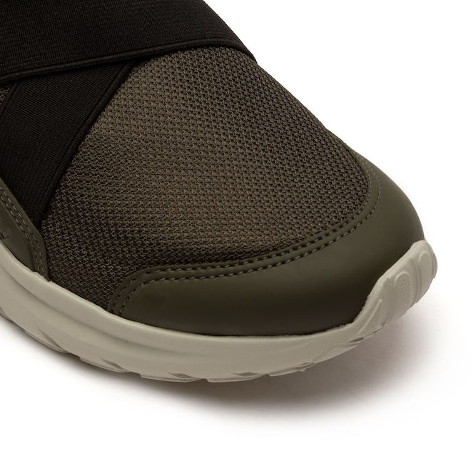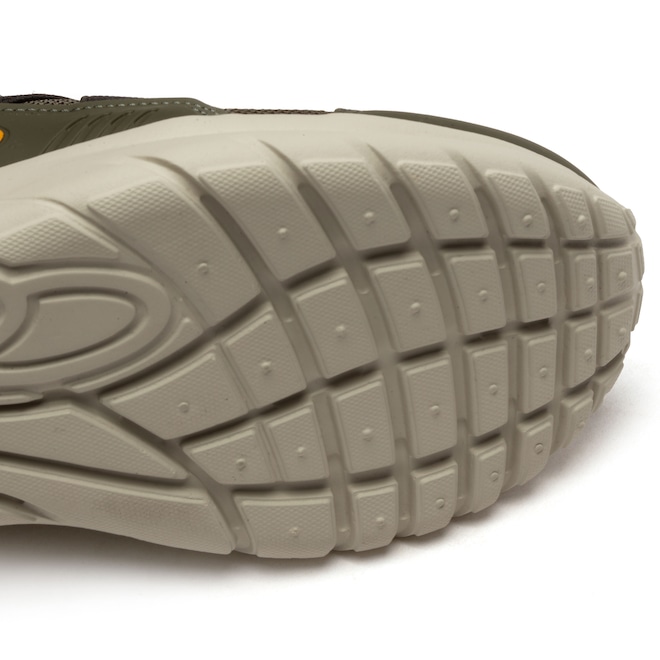 O seu cabedal é sintético, a entressola é em EVA e o solado é leve com cortes para flexibilidade.