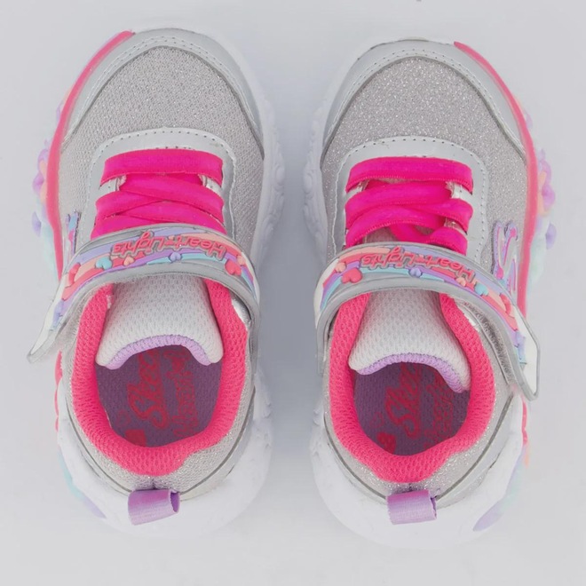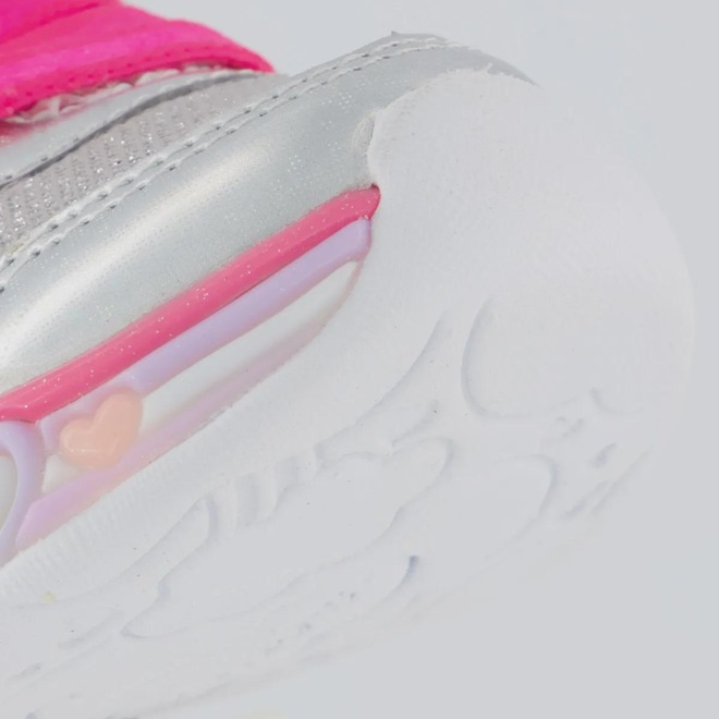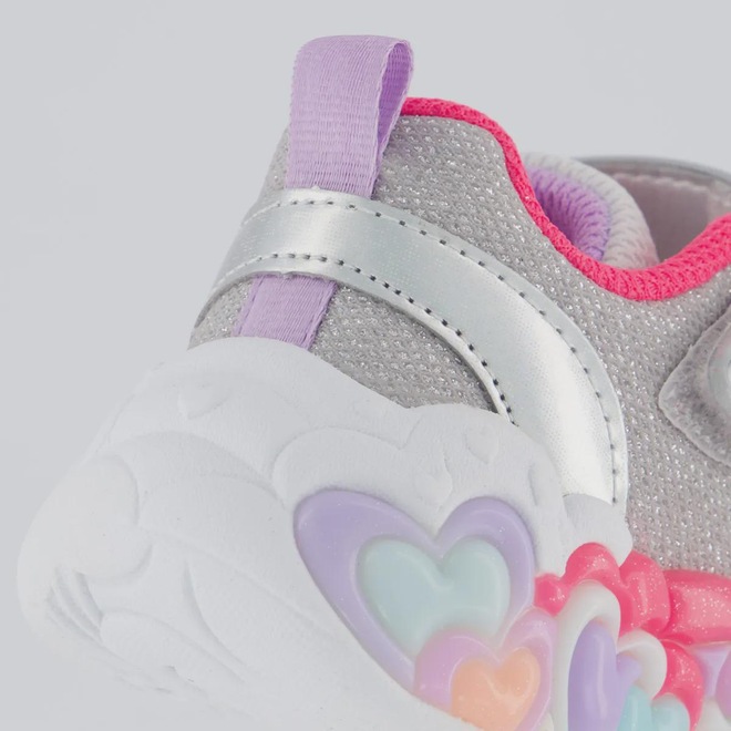 Tecnologias S-Lights: Luzes de LED coloridas integradas aos detalhes de coração no solado, que piscam conforme a criança caminha ou corre. Non-Marking: Solado composto por uma borracha especial que não deixa marcas, riscos ou manchas no piso, sendo ideal para superfícies de quadras internas. Composição cabedal (parte superior): Têxtil com detalhes em sintético Forro: Material têxtil com acolchoamento reforçado Solado: Borracha resistente e antiderrapante, colado de 4 cm Palmilha: Em EVA forrado e moldado Lingueta: Integrada Cor predominante: Prata Indicado para: Casual Origem: Importada Ajuste: Elástico e fecho fixado Gênero: Feminino Idade: Infantil Peso aproximado: 200g o par n° 21