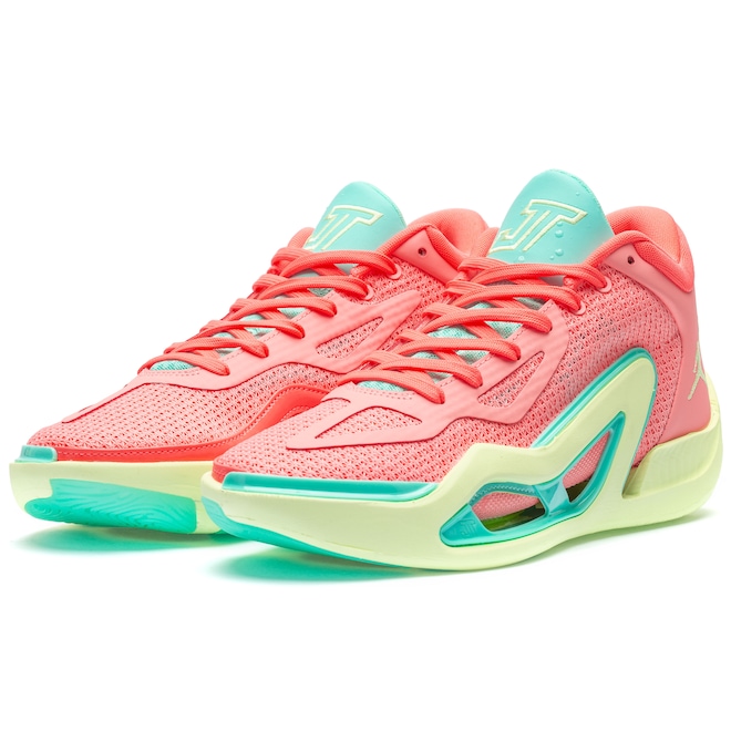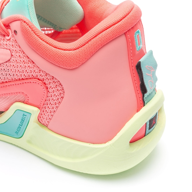 O Nike Tatum 1 Pink Lemonade tem cabedal sintético, sua entressola é em EVA e o solado emborrachado.
