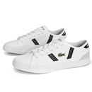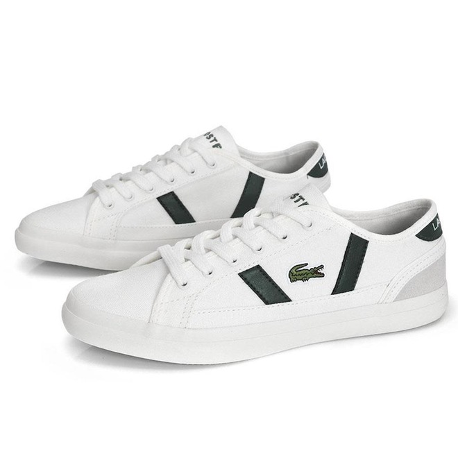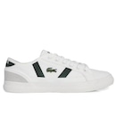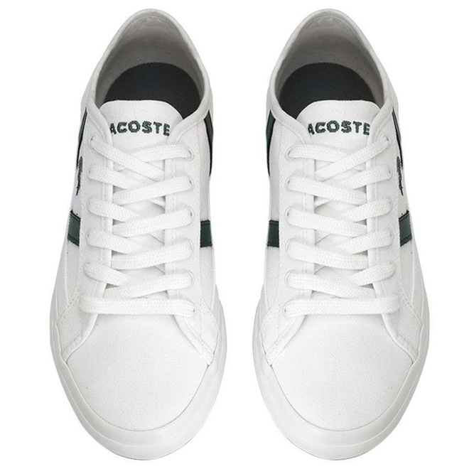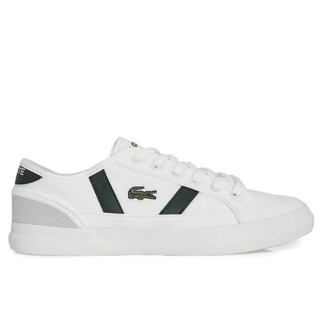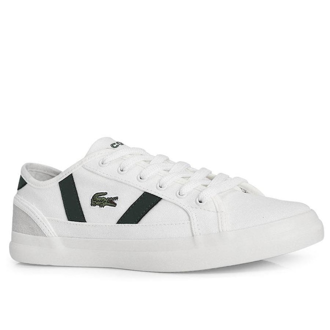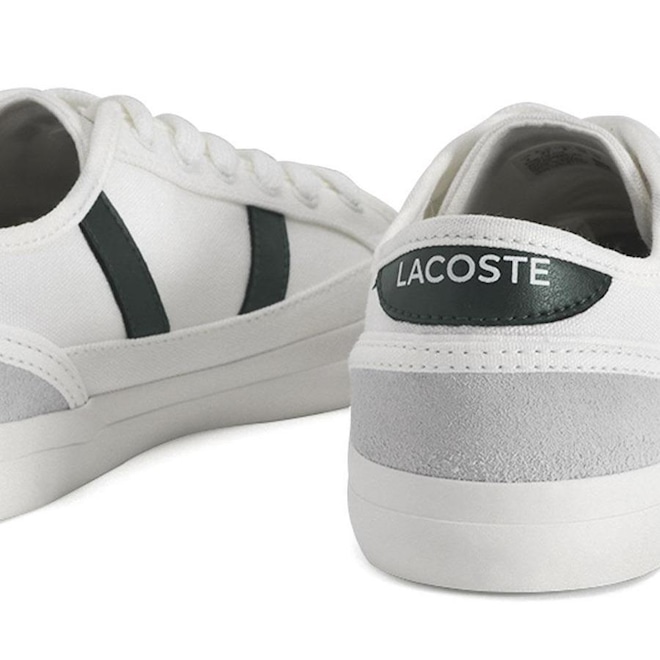 Conheça as características do Tênis Lacoste Sideline Branco e Verde - Perfil: Casual - Cabedal: 80% algodão, 13% couro e 7% sintético - Solado: Em borracha para melhor aderência ao solo - Detalhamento: Fechamento em cadarço, faixa diagonal nas laterais com logo Lacoste bordado na lateral externa, marca Lacoste próximo ao calcanhar, escrita Lacoste na lingueta.