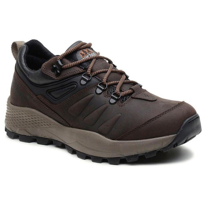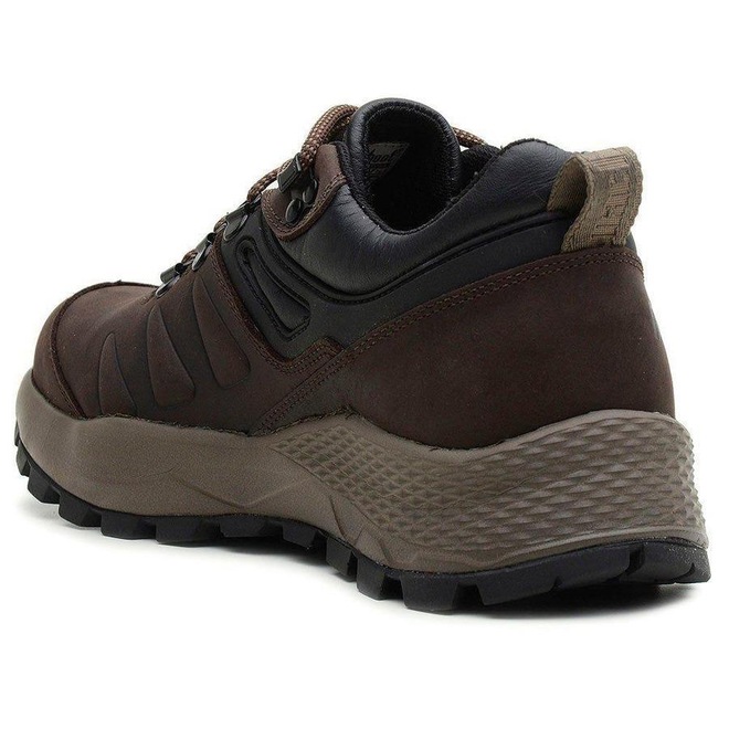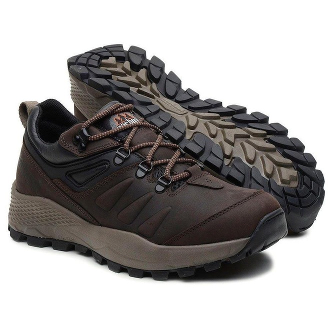 Solado - Seus desenhos proporcionam um amplo apoio ao solo e distribuição do peso através de sua compensação de salto e planta, resultando em conforto adicional em um solado robusto em borracha de alta resistência a abrasão de 150mm³, valor este dentro da recomendação para calçados de alto uso.