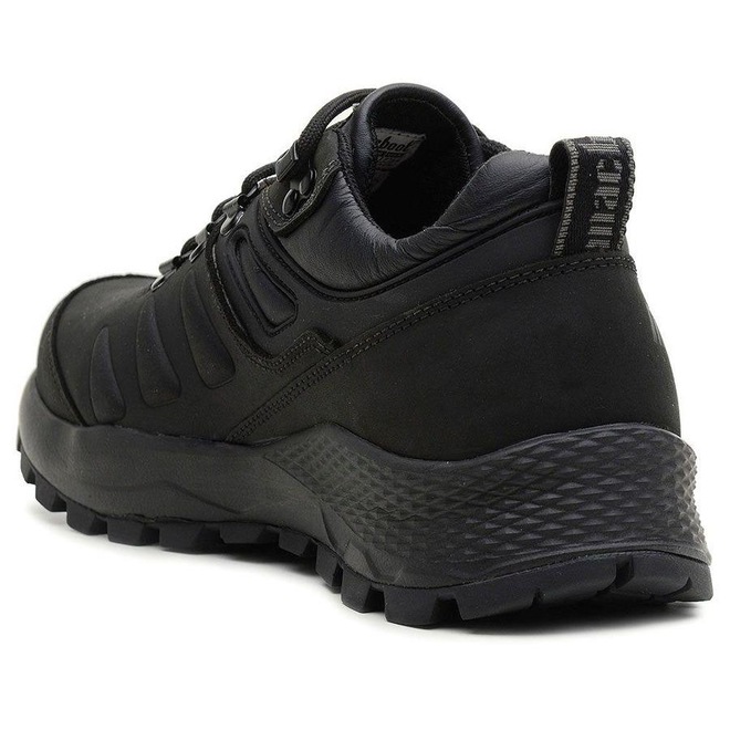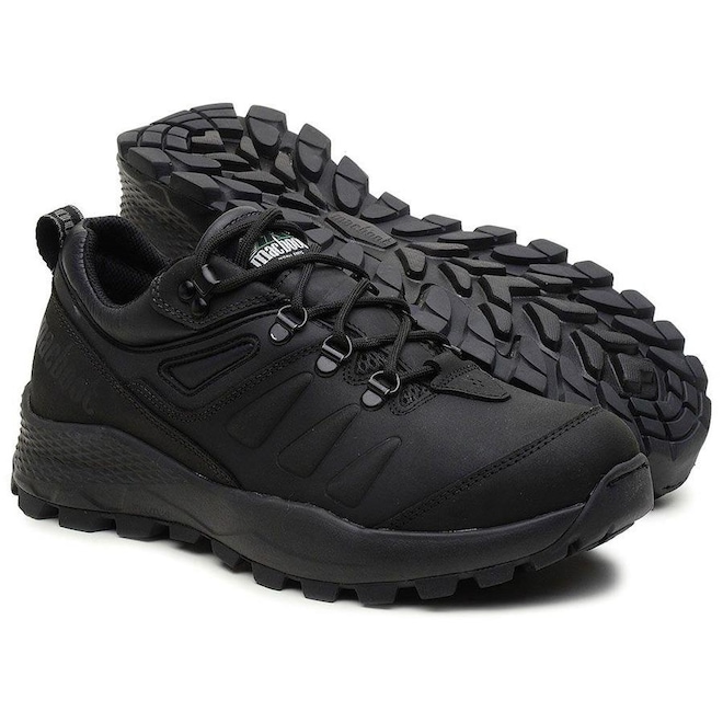Solado - Seus desenhos proporcionam um amplo apoio ao solo e distribuição do peso através de sua compensação de salto e planta, resultando em conforto adicional em um solado robusto em borracha de alta resistência a abrasão de 150mm³, valor este dentro da recomendação para calçados de alto uso.