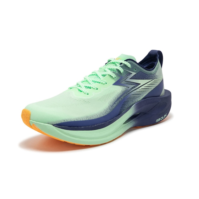 Entressola com dupla camada de material CQT e placa de nylon em formato de pá, proporcionando amortecimento, retorno de energia, estabilidade e propulsão para o movimento.