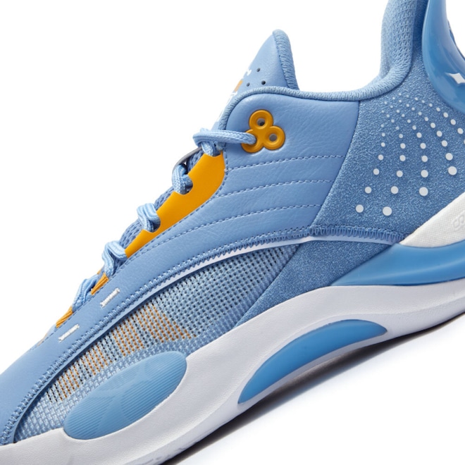 Um grande TPU em volta do calcanhar proporciona estabilidade e firmeza em cortes laterais e mudanças bruscas de direção. O design é finalizado com uma coroa icônica de Jokić no calcanhar, reforçando a personalidade do modelo.