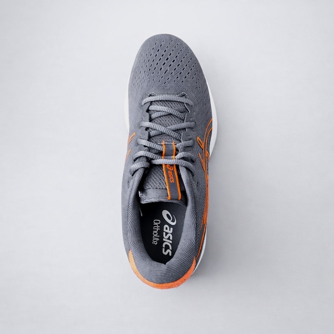 O solado em borracha resistente garante ótima aderência e durabilidade, oferecendo mais confiança em diferentes tipos de piso. Já o design moderno em cinza com detalhes em laranja traz personalidade e versatilidade para combinar com diversas produções esportivas.