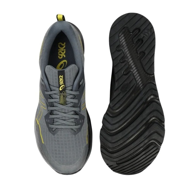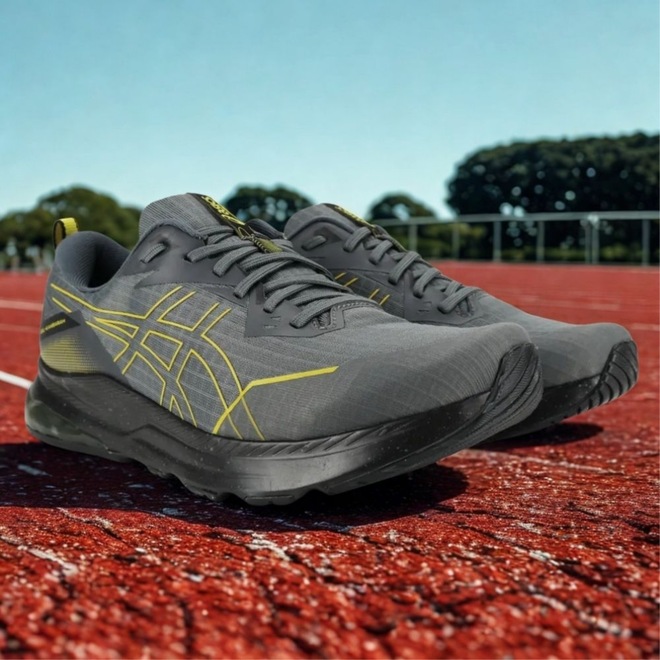 Cabedal: Tecido ripstop mais fechado com inspiração nos modelos Fuji Lite 4 e GEL-Excite Trail 2, biquera em TPU fusionada