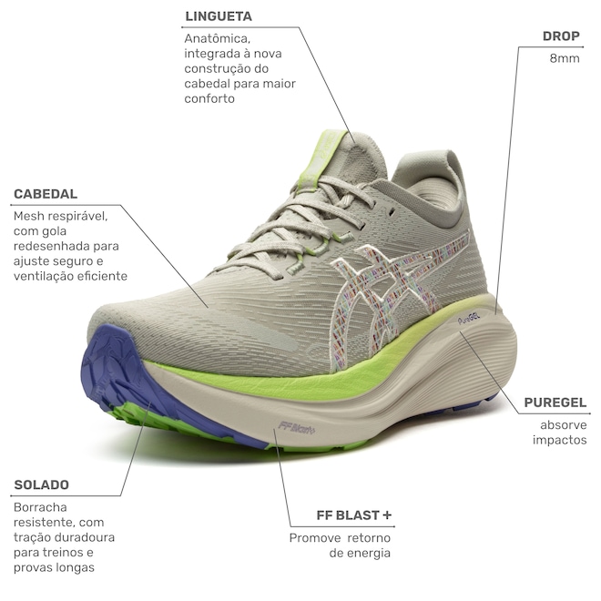 A entressola com FF Blast™ Plus Eco proporciona amortecimento superior e sustentabilidade, combinada com o PureGel que suaviza o impacto em cada passada.