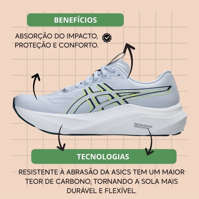 -3D GUIDANCE SYSTEM™: sistema de estabilidade adaptável que mantém o controle das passadas e promove corrida mais equilibrada.